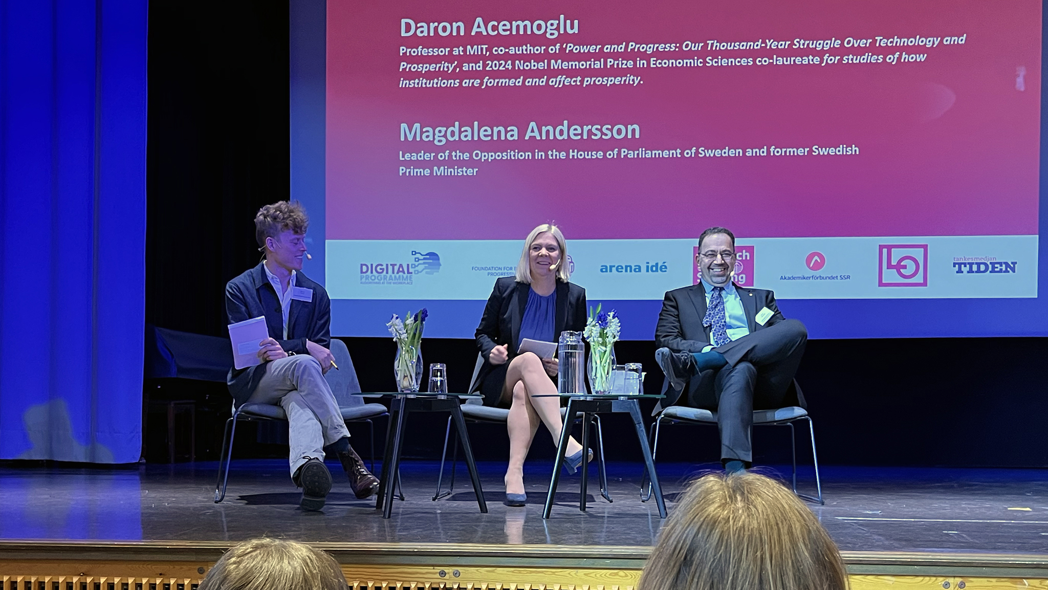 Simon Vinge från Akademikerförbundet SSR och Magdalena Andersson (S) samtalade med Daron Acemoglu på scenen. Foto: Annika Clemens
