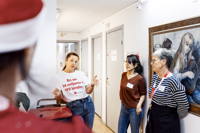 Ett par gånger i månaden besöker Johanna Saunders, som ju jobbar mer strategiskt och övergripande, Röda korsets verksamheter. Hon har Malmö som bas men berättar att det bara var en enda vecka under hösten som var fri från resor. Vi tiden för vår intervju är hon nyss hemkommen från ett erfarenhetsutbyte i Kirgizistan. Annars går färden ofta till Stockholm och möten med politiker och myndigheter, eftersom en stor del av hennes jobb handlar om påverkansarbete.