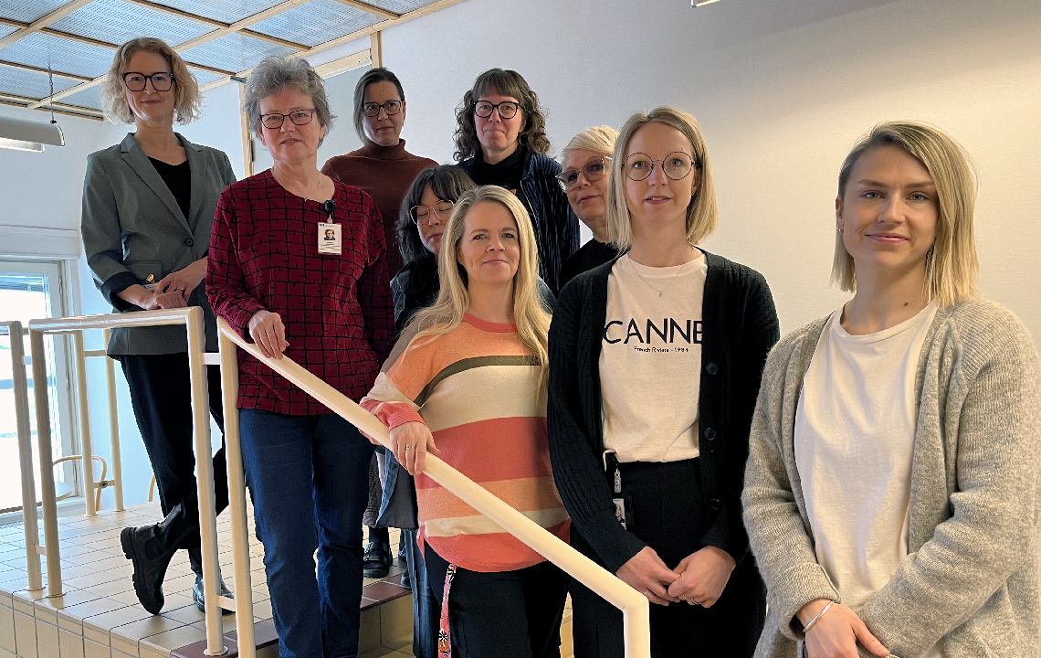Kuratorerna på sjukhuset i Umeå hoppas på en snar lösning, sedan Akademikerförbundet SSR har lyft frågan med ledningen. Från vänster: Viktoria Leek, Carina Renberg, Tåwe Oscarsson, Jennie Ylvin, Linda Henriksson, Katarina Sjögren, Maria Lövenvald, Linnea Brolin och Paulina Westermark.