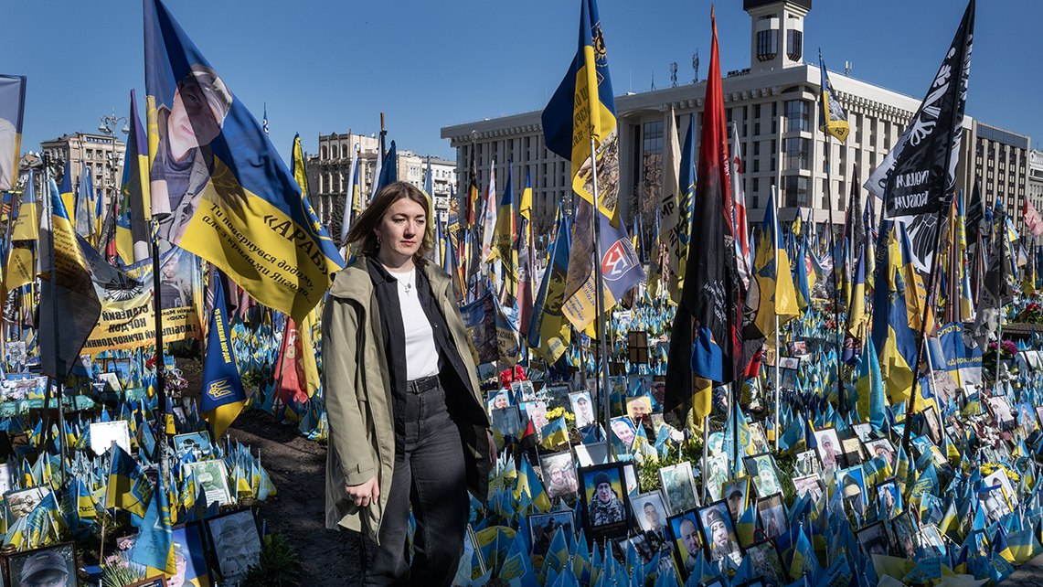 Nu domineras torget av minnesmärken och flaggor som hedrar de stupade – en bedövande påminnelse om priset ukrainarna betalar för att försvara sitt land.