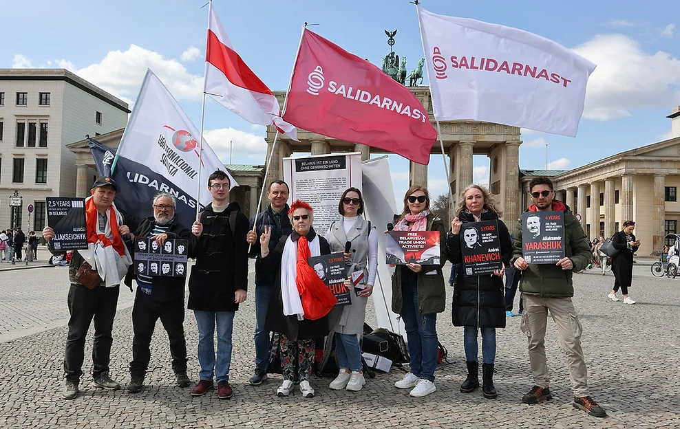 Maryia Taradzetskaya och kollegorna i Berlin, som har bildat exilfackförbundet Salidarnast, demonstrerade förra året den 19 april mot Lukashenkos förtryck i Belarus.