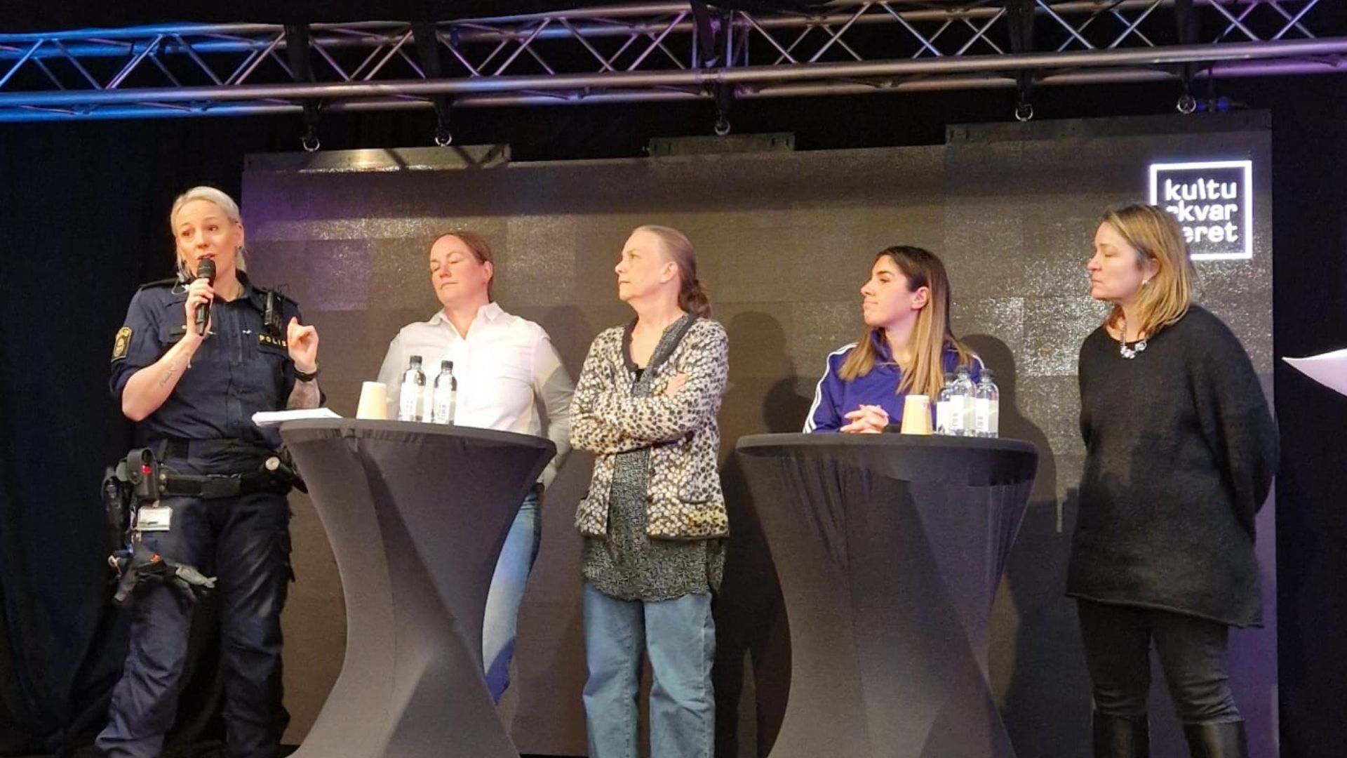– Den yngsta jag har mött var åtta år. Han vaktade en port, berättade Ekerheim Matsman från polisen. I panelen var också Karin Hellfeldt, forskare vid Örebro universitet, Cecilia Kalén kurator vid Ängens familjecentral, Selma Mahic, ungdomscoach på Tegelbruket och Johanna Sollerman, brottsförebyggande strateg. Foto: Rebecca Ekström