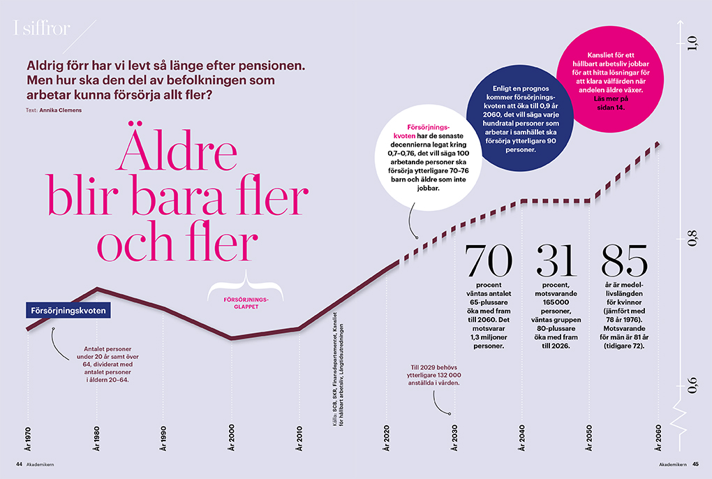 Den demografiska utvecklingen gör att gruppen som arbetar blir en allt mindre andel av den totala befolkningen i takt med att gruppen 65-plus växer. Det i sin tur leder till att gruppen förvärvsarbetare 20-64 år måste försörja allt fler. Redan till 2026 väntas antalet 80-plussare öka med 165 000 personer, 31 procent. Antalet 65-plussare väntas öka med 70 procent till 2060. Det motsvarar 1,3 miljoner personer.