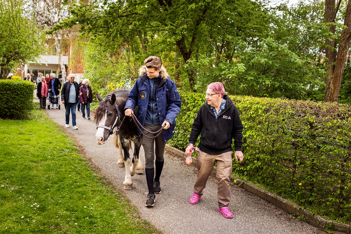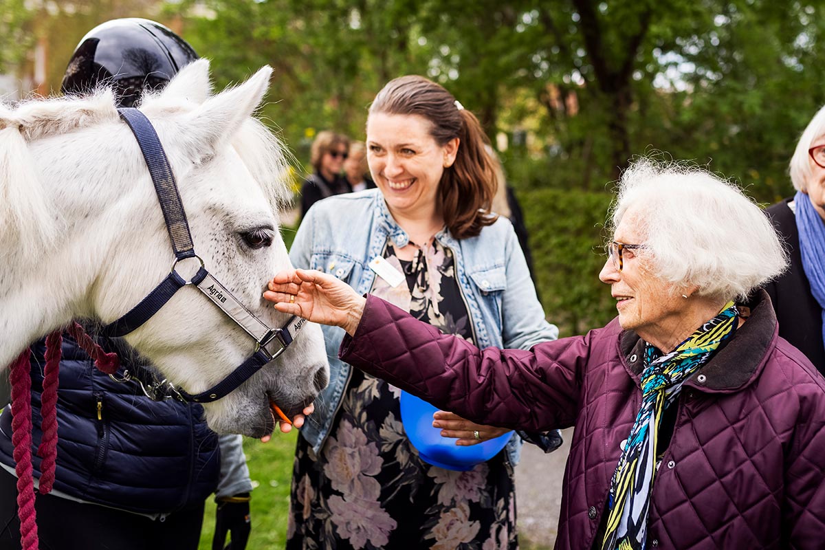 Just den här dagen vankas det ponnybesök på Trivselpunkten. Ridskolan i Staffanstorp finns på plats och alla som vill får komma och klappa och bjuda hästarna på morötter ute i trädgården.