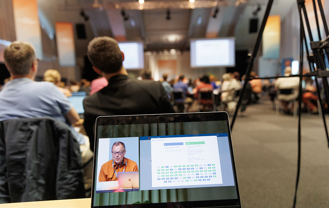 En lång rad motioner avhandlades på lördagen på Akademikerförbundet SSR:s kongress. Några handlade om skyddsombudens roll. Benny Johansson höll i ordförandeklubban under mötets gång. Foto: Theresia Viska