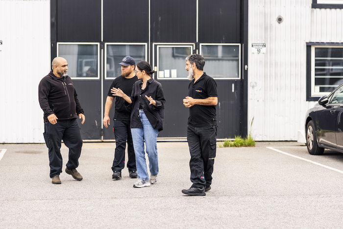 Seher Yilmaz träffar Salim Fathi Dasuqi, Mahmoud Hamad och Basem Al Zoheiri vid kontoret i Löddeköpinge. Foto: Christian Andersson