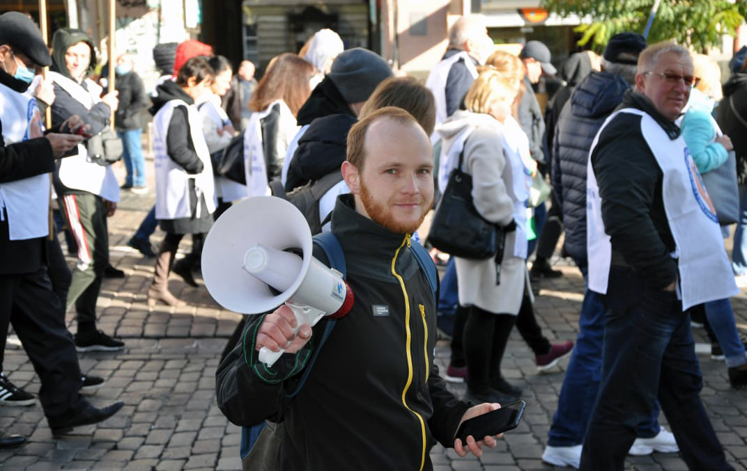 Artem Tidva på en facklig demonstration i Ukraina hösten 2021. Foto: Privat.