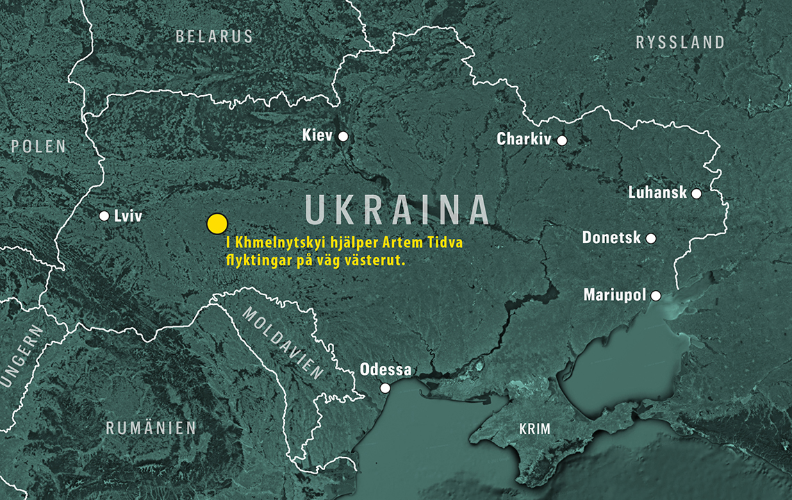 Artem Tidva befinner sig i Khmelnytskyi. Han lämnade Kiev på krigets andra dag och hjälper nu andra som lämnat sina hem på grund av kriget. Karta: Christian Williamsson.