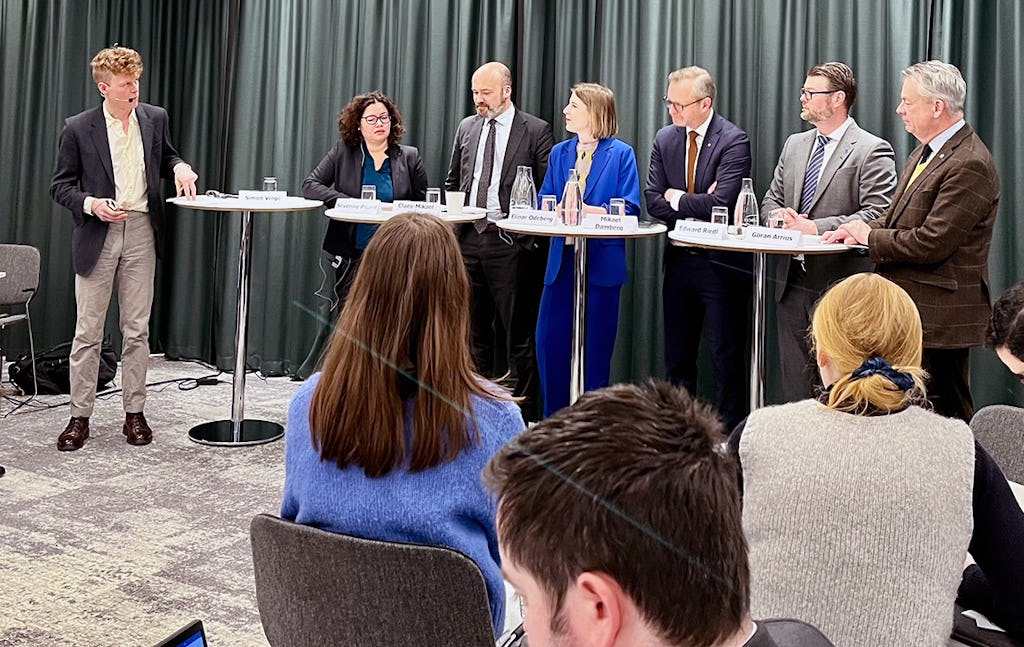 Simon Vinge, Akademikerförbundet SSR, höll i skatteseminariet där bland andra Edward Riedl (M) och Mikael Damberg (S) deltog, samt Saco-ordförande Göran Arrius. Foto: Akademikerförbundet SSR.