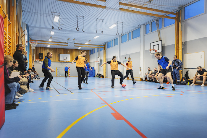 Målvakten hejar på lagkamraterna som spelar fotboll i den lilla idrottssalen i Östbergaskolan sent en fredagseftermiddag. Bänkarna intill väggen är fullsatta när Stena fastigheter arrangerar fotbollsmatcher med polisen, räddningstjänsten och ungdomar från Stockholmsförorten. Lokalen fylls av busvisslingar och applåder och ljudnivån är uppe på rött när något av lagen gör mål.